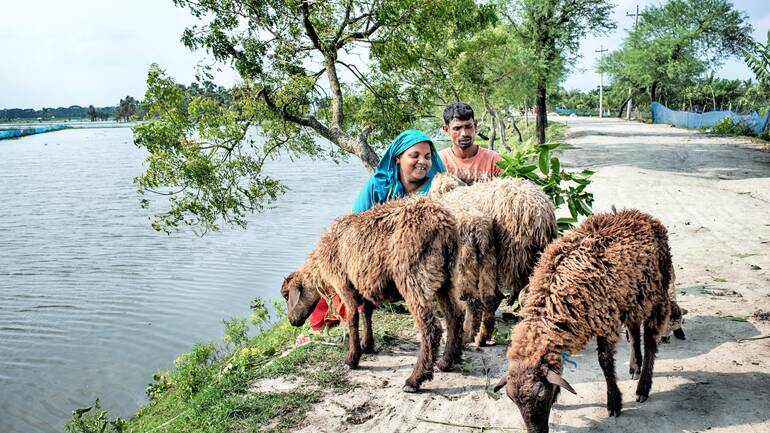 Shilpi Khatun kümmert sich zusammen mit ihrem ältesten Sohn um ihr Vieh. Sie sparte Geld durch den Verkauf von Gemüse und Fisch und kaufte später Kühe und Schafe. Shilpi Khatun und ihr Ehemann Ziarul Islam haben in ihrem Hausgarten hart gearbeitet und Gemüse und Obst angebaut. Sie begannen auch mit der Fischzucht in dem Teich neben ihrem Haus.