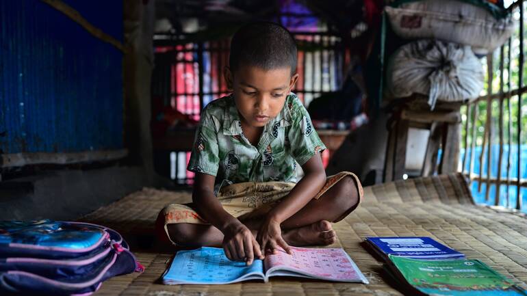 Shilpi Khatuns Sohn Tamim Hasan macht in ihrem Haus Schulaufgaben. Dank der Erträge aus ihrem Gemüsegarten kann Shilpi ihre Kinder ernähren und ihnen eine bessere Ausbildung ermöglichen.