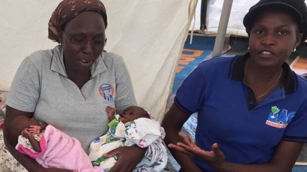 Asha, eine dreifache Mutter aus Pakistan, zusammen mit ihrer Tochter Ishani. Die Kleine hat eine Packung Erdnusspaste in der Hand, die ihr dabei hilft, wieder zu Kräften zu kommen.