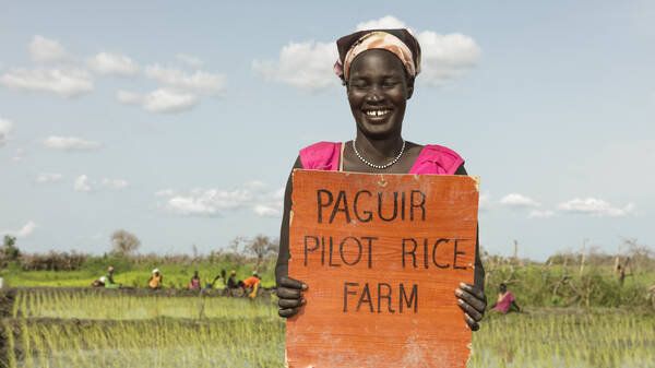 Sorghum ist ein wichtiges Hauptlebensmittel im Südsudan, fast bei jeder Mahlzeit landet die Hirseart auf dem Teller. Die Überschwemmungen im Jahr 2020 haben vor allem im Norden die Felder geflutet und das Wasser will seit Jahren nicht abfließen und macht den Anbau des Getreides unmöglich. Gemeinsam mit Aktion gegen den Hunger hat eine Gemeinde in Paguir jetzt aus der Not eine Tugend gemacht – und nutzt die nassen Felder für den Anbau von Reis. Ein völlig neues Nahrungsmittel mit ungeahntem Potenzial.